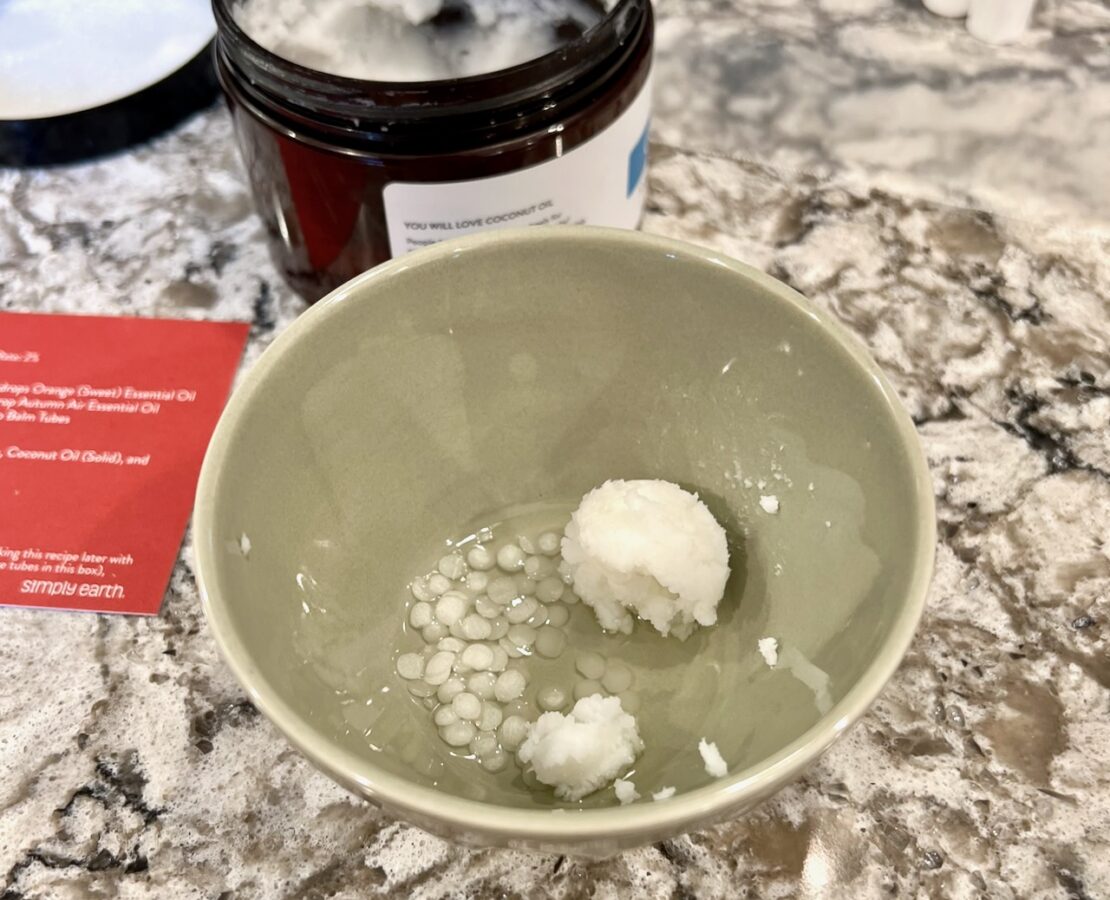 The first step was to melt the solid coconut oil, beeswax, and almond oil together in a microwave-safe bowl.