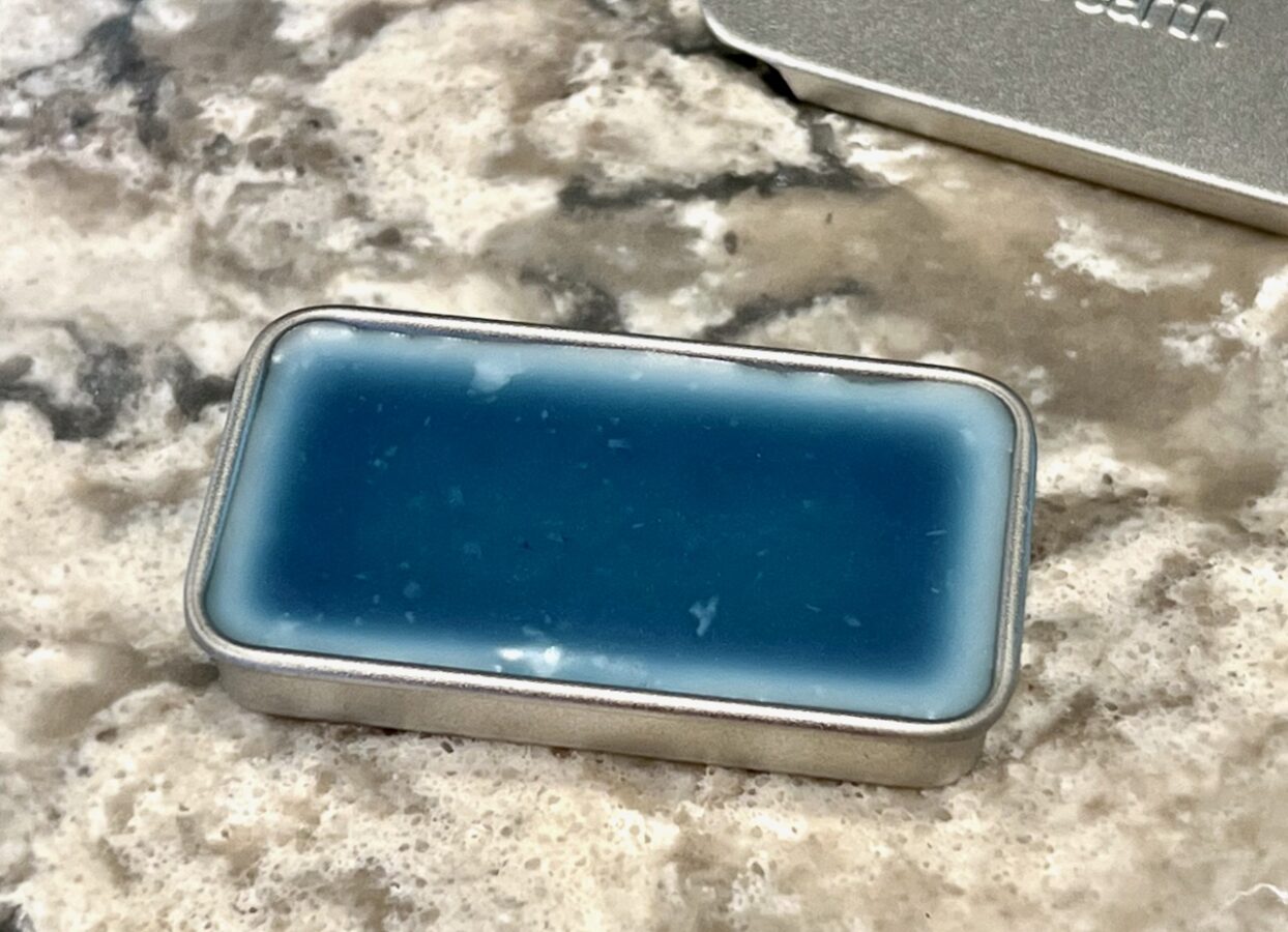 Supplies needed: Beeswax*, almond oil*, sweet orange essential oil, autumn air essential oil blend, pine essential oil, indigo blue mica powder, and a rectangle cosmetic tin.