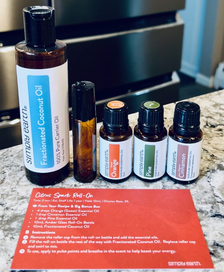 Supplies needed: Sweet orange essential, cinnamon essential oil, pine essential oil, fractionated coconut oil*, and a 10mL roll-on bottle*.