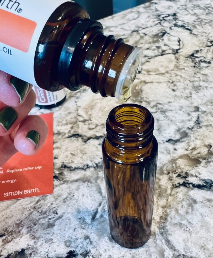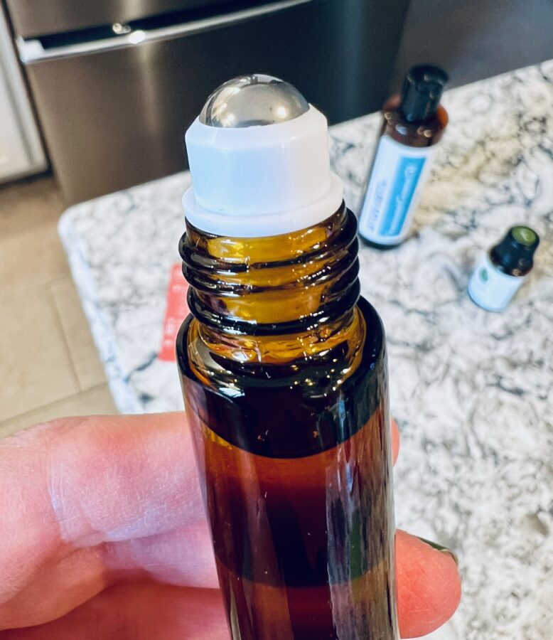 This easy recipe simply involved placing a specified amount of essential oil into the roll-on bottle and filling the rest up with coconut oil.