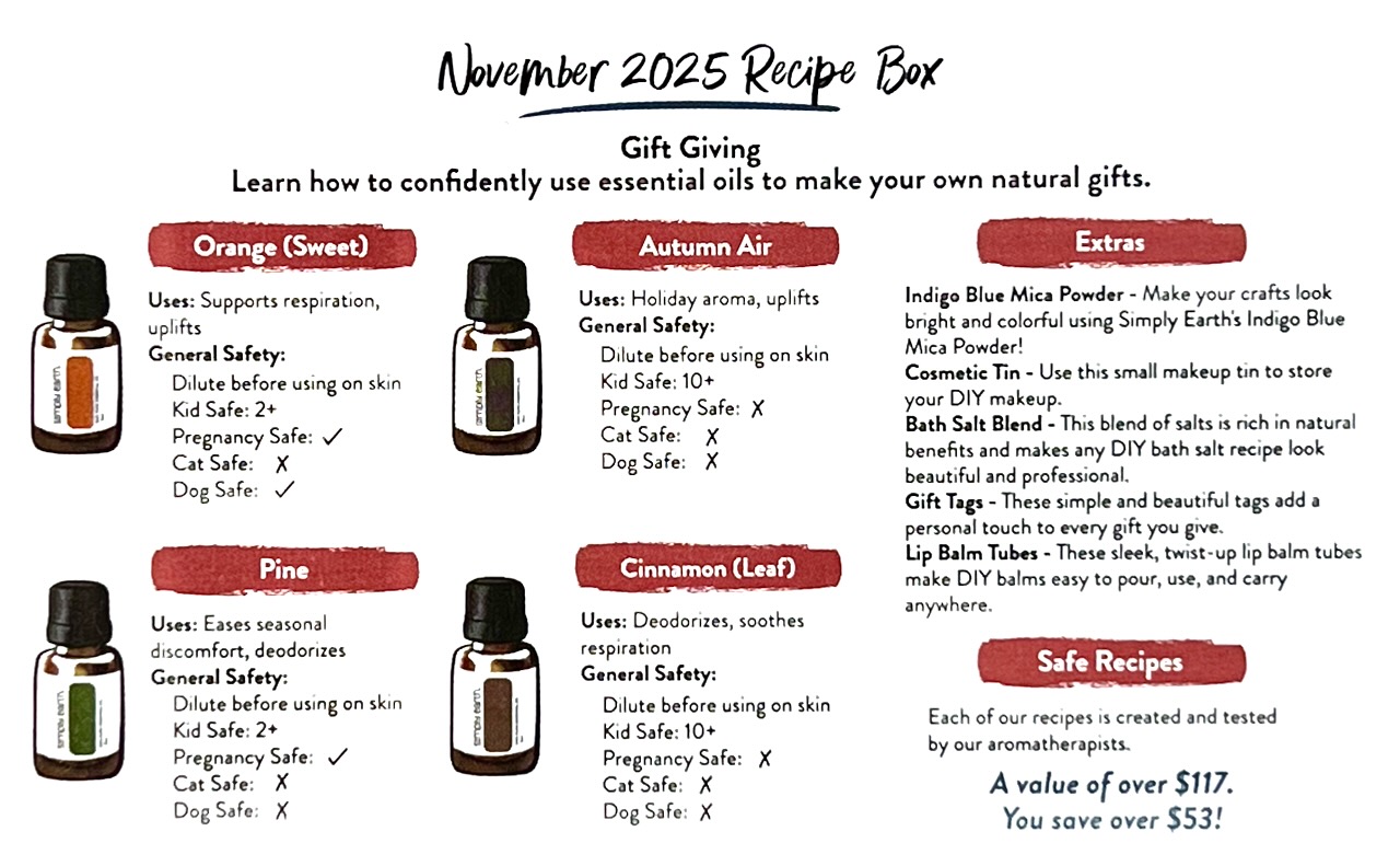An info card (printed on the back of one of the recipe cards) revealed November’s theme: “Gift Giving”. It listed this month’s featured oils, along with any included extras. It also provided a few safety tips for each oil/blend.