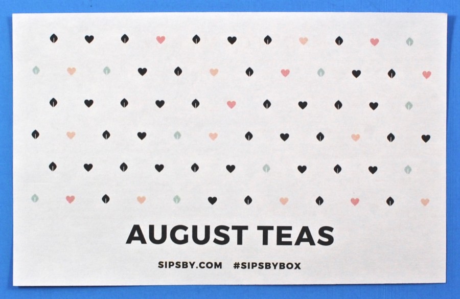 A personalized info card listed all of the teas included in my August Sips By box, along with brief descriptions, steeping times, and coupon codes.