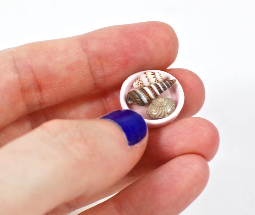 Tray of Seashells – A pale pink pottery tray filled with actual (teeny tiny) seashells! — Don’t worry, they’re glued in place so you needn’t be concerned about them tumbling out/getting lost/being eaten by your cat.