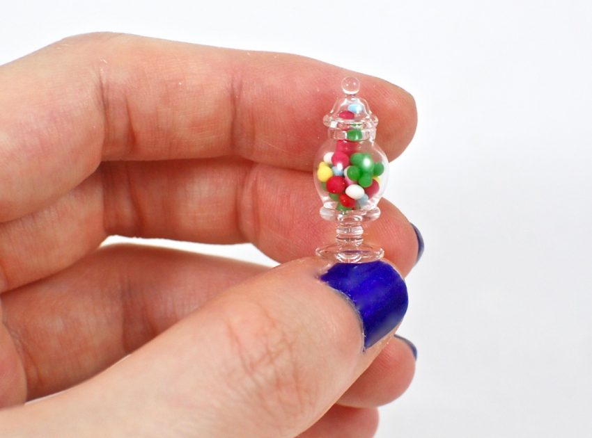 Candy Jar – Candy!! A real glass apothecary jar is filled will (not so real) mini gumballs. I remember my mom having something like this in her dollhouse when I was little and it was one of my favorite things to look at — or play with carefully.