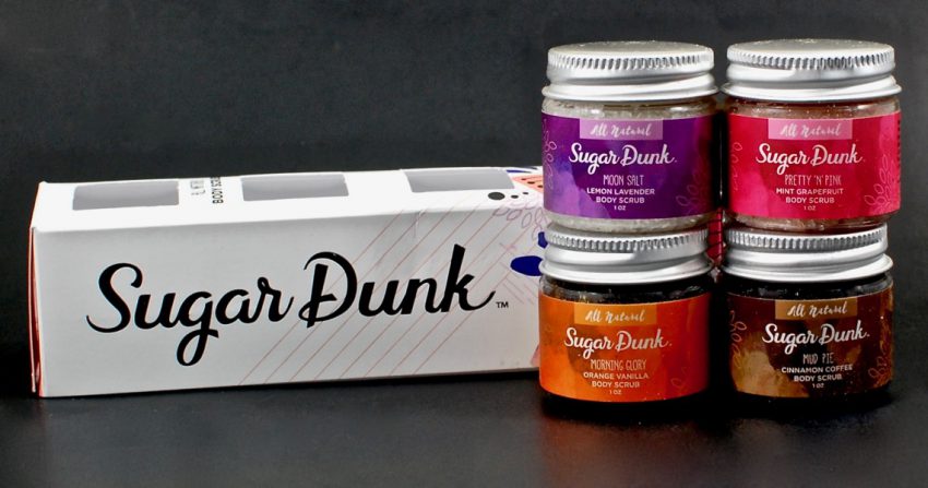 A cute little sampler set of 4 mini body scrubs from Sugar Dunk. The scrubs are all natural & vegan-friendly and the following scents were included: Pretty N’ Pink (mint grapefruit), Morning Glory (orange vanilla), Moon Salt (lemon lavender), and Mud Pie (cinnamon coffee). Both salt and sugar based scrubs were included (2 of each).