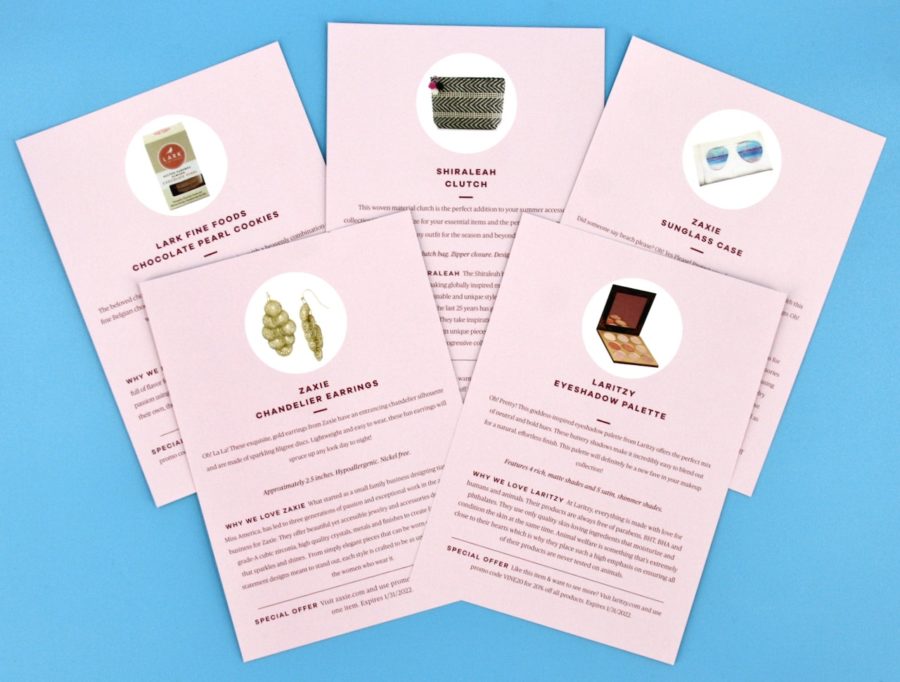Individual cards provided more details about each product and also included special offers for Vine Oh! subscribers.