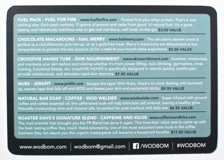 Wow! I had no idea what to expect from WODBOM, but I was totally impressed. The items were all practical and useful even for a non-fit person like myself (well, except the nubs, unless I decide to use ’em as thumb warmers). Can’t go wrong with coffee, soap, and vegan treats! The value was great too — over $50 in products total. Not bad at all!