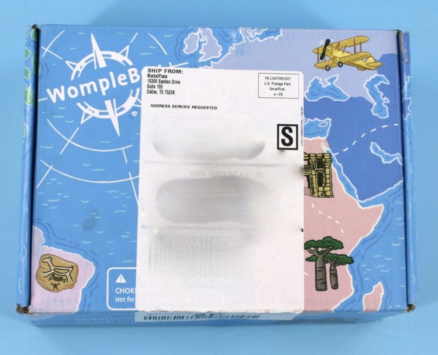 Everything was shipped in a blue box with colorful map graphics and a white WompleBox logo in the top left corner.