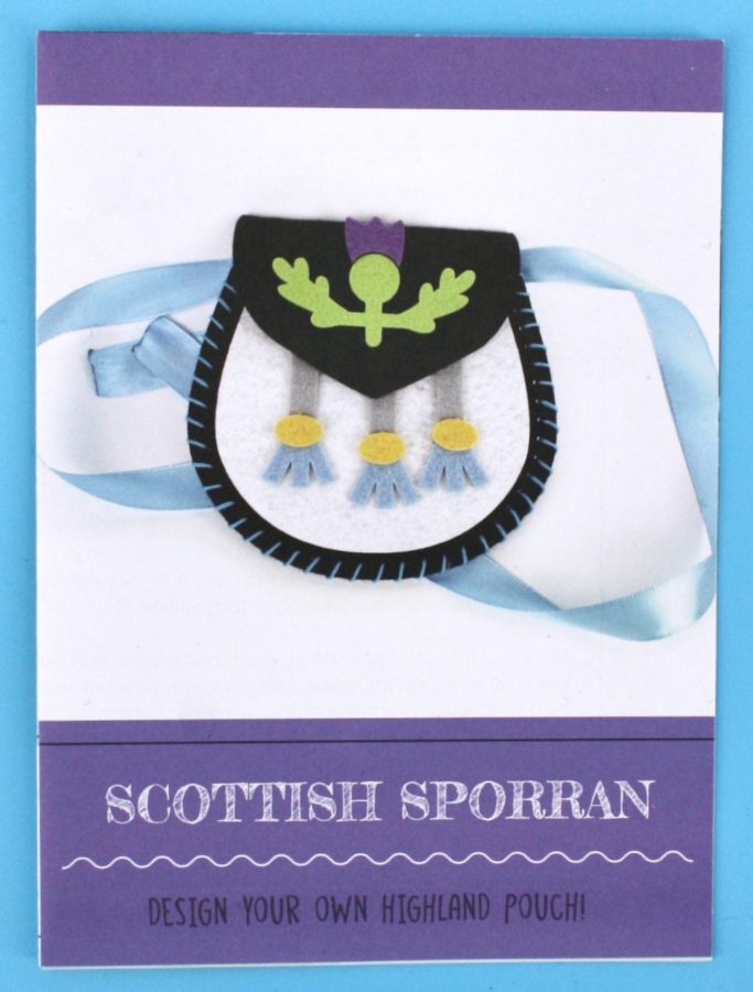 A sporran is a traditional part of male Scottish Highland dress — a pouch that performs the same function as pockets on the pocketless kilt. Materials included a large black felt piece, a white sticky felt piece, a smaller black felt piece, a needle, string, blue ribbon, and an assortment of smaller colored sticky felt pieces.